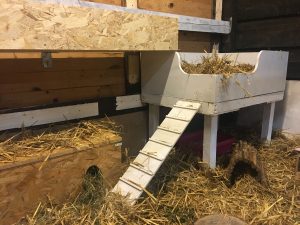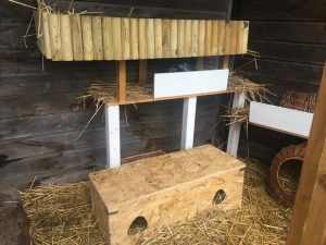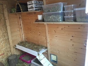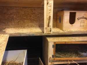Unsere Mädels leben zusammen mit einem Kastraten in einem geschützten Gehege in unserem Gartenschuppen mit Durchschlupf zum Außengehege. Im Gehege befinden sich abtrennbare kleine Bereiche mit Wurfkisten, in die sich die Häsinnen für die Geburt ihrer Jungen zurückziehen können. Sie haben so die Möglichkeit, tagsüber Stunden in ihrer Gruppe zu verbringen und sich danach wieder in Ruhe ihren Jungen widmen zu können. Nach zwei oder drei Wochen können die Häsinnen mit Wurfkisten wieder komplett in die Gruppe ziehen. Würfen in der Gruppe sind natürlich willkommen, wir möchten den Häsinnen jedoch bei Bedarf die Möglichkeit des abgetrennten Rückzugs um die Geburt herum anbieten.